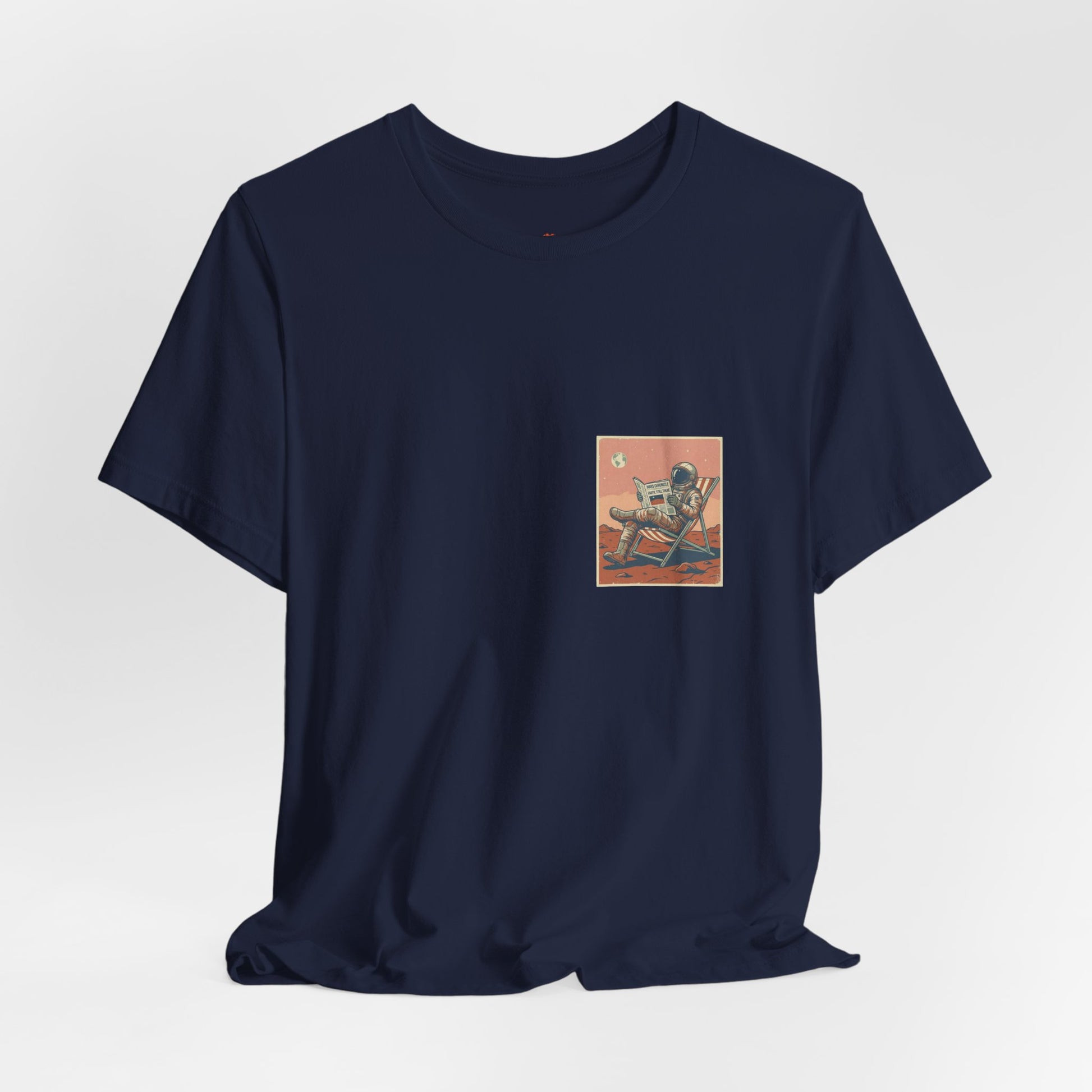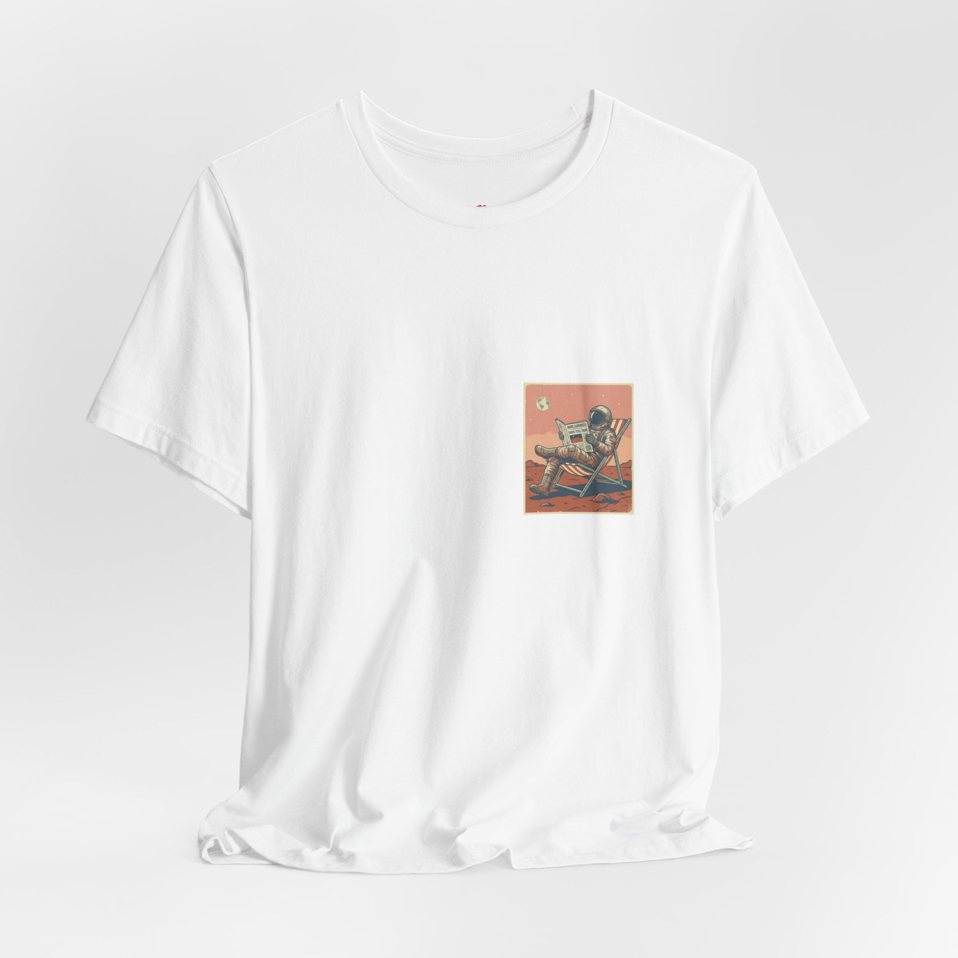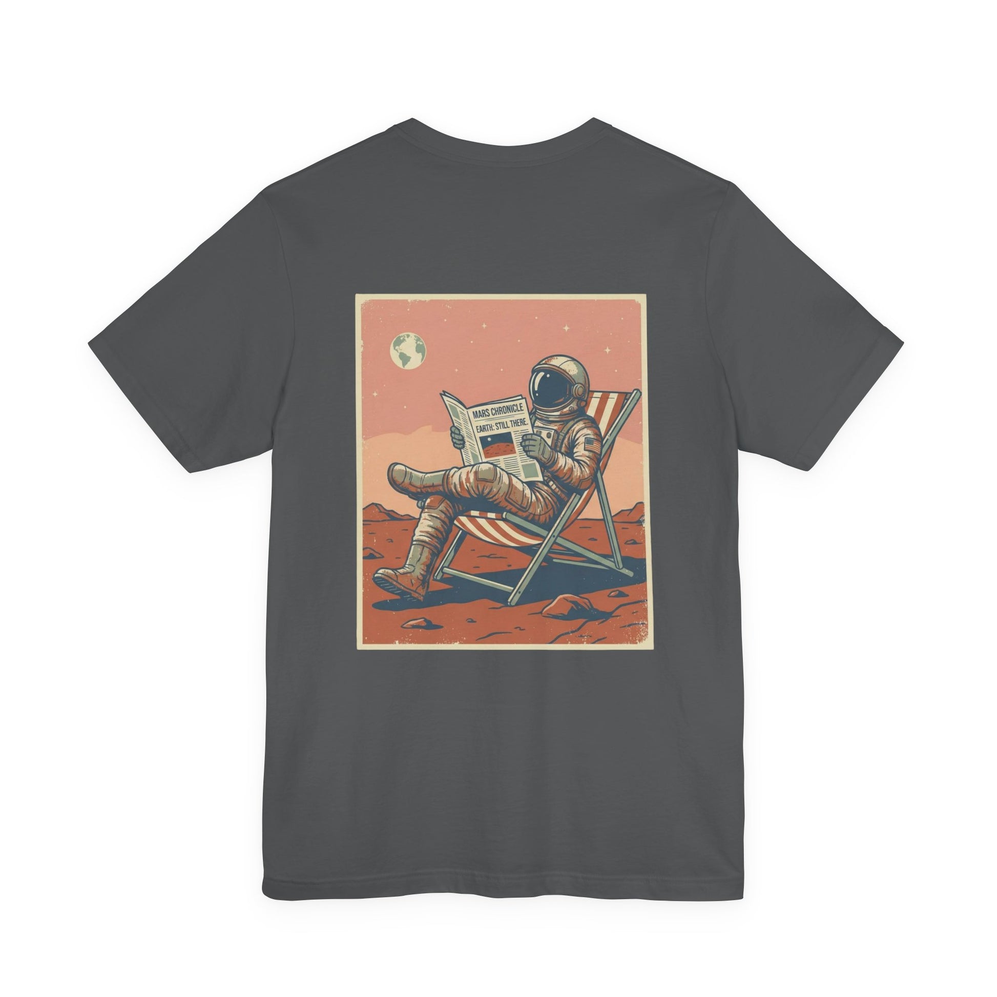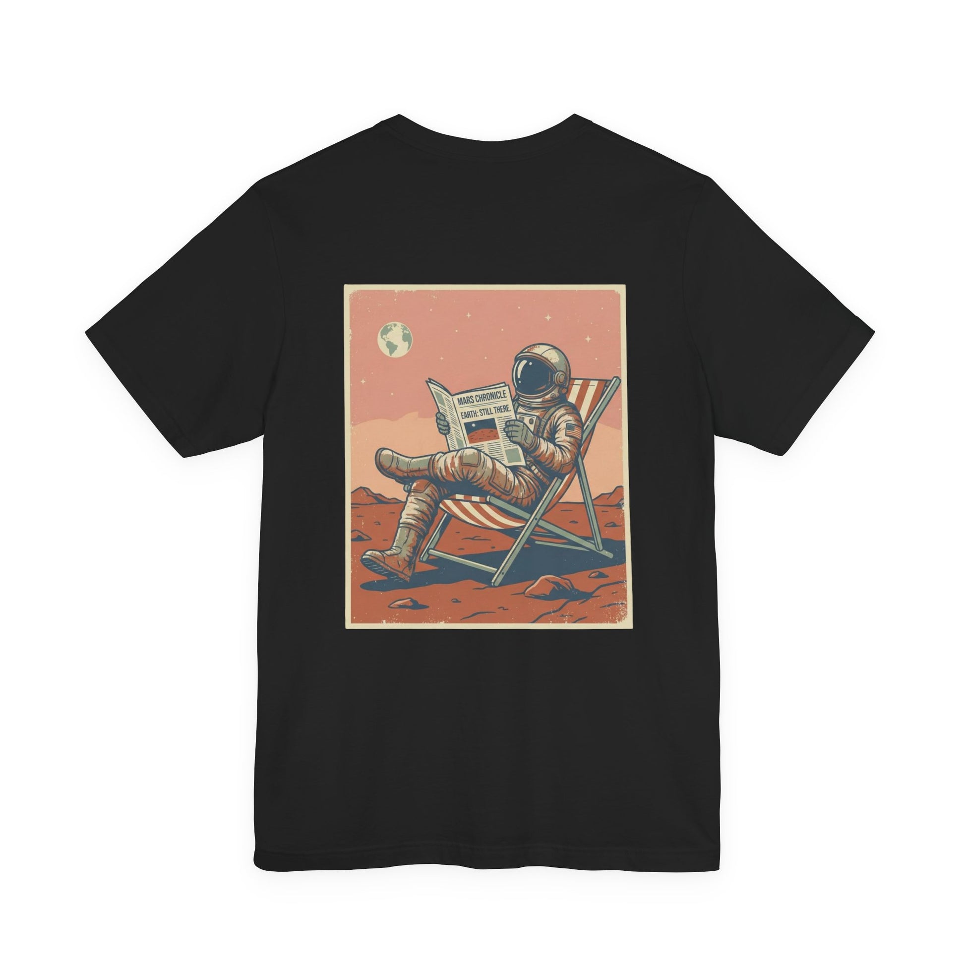 An astronaut kicking back on a Martian deckchair, catching up on the Mars Chronicle. Headline: Earth Still There. The ultimate holiday postcard from the red planet.