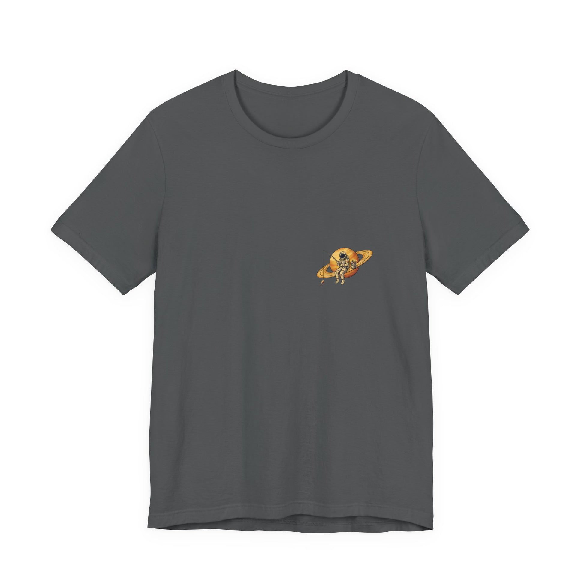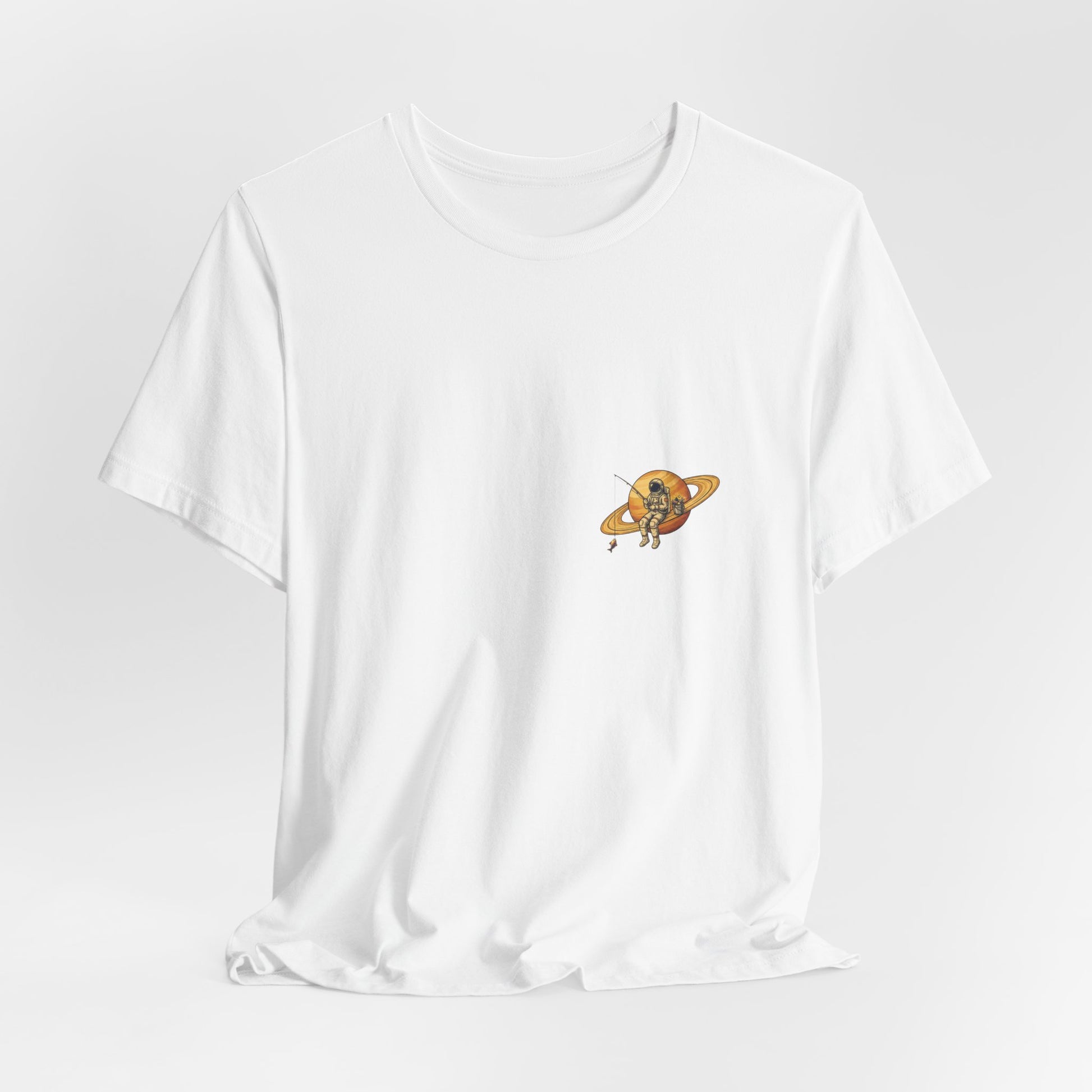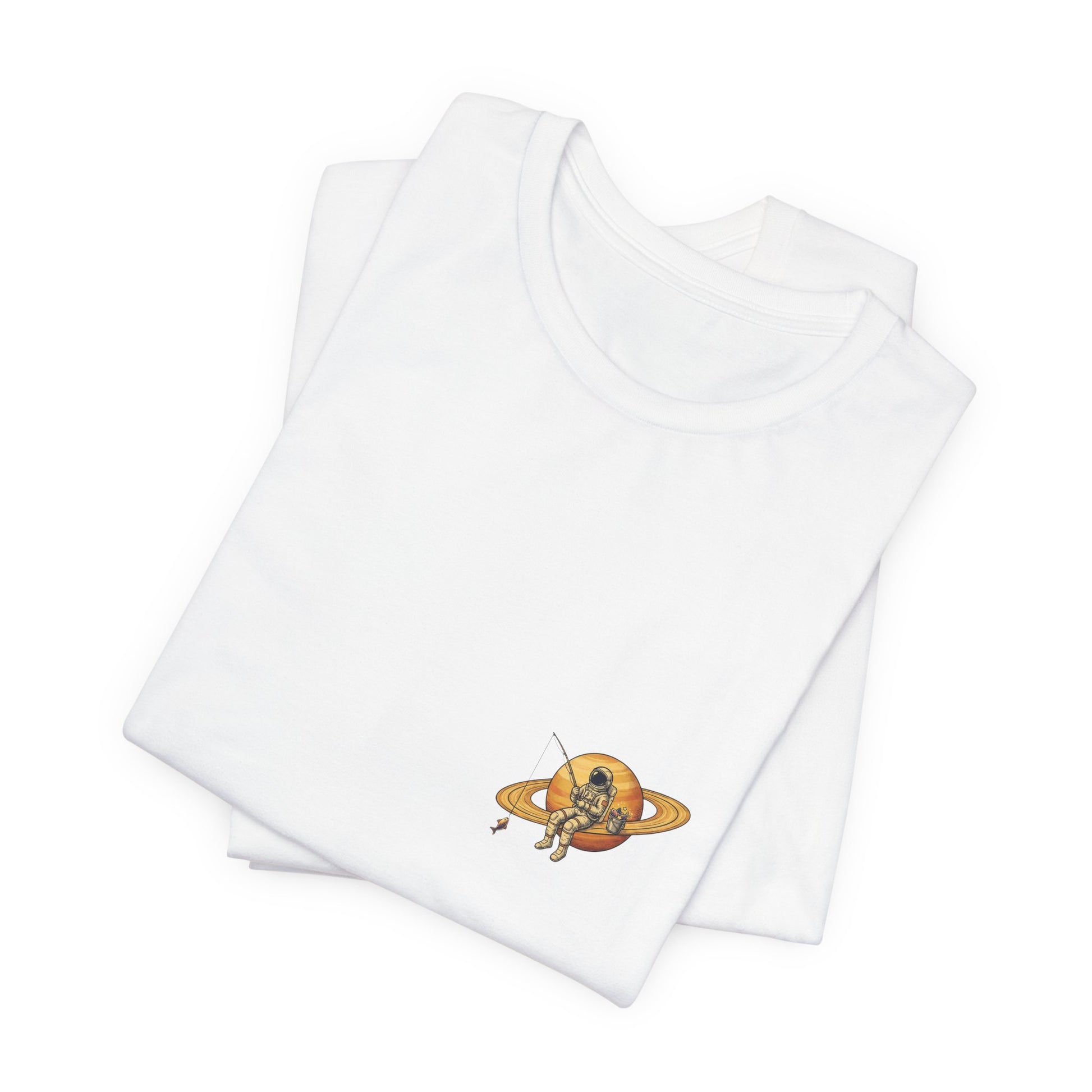 An astronaut perched on Saturn's rings, rod cast into the cosmic void, bucket of space fish beside him. Sometimes you just need to get away from it all. Way, way away.